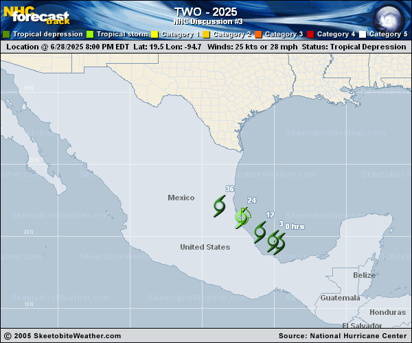 Copy of official data Tropical Depression Two Discussion Number 3 NWS National Hurricane Center Miami FL AL022025 400 AM CDT Sun Jun 29 2025 The Air Force Hurricane Hunters have been investigating the depression over the Bay of Campeche this morning and found that the system is quite disorganized. In fact, the depression may not even have a well-defined circulation. Even though the structure of the system is poorly organized, the aircraft data and ship observations indicate that the winds have increased some. Based on that information, the initial intensity is nudged upward to 30 kt. The depression has been moving a little to the south of the previous forecast, and the latest initial motion estimate is 290/8 kt. The system is expected to turn northwestward later today as it tracks along the western periphery of a low- to mid-level ridge. This motion should take the cyclone inland over eastern Mexico late today or tonight. Most of the strong winds are expected to occur to the north of the center along the coast within the tropical storm warning area this afternoon through early Monday. Some slight additional strengthening is possible before the system moves inland. However, none of the models show much intensification and given the poor initial structure and limited time over water, significant strengthening seems highly unlikely. The system is expected to dissipate over the rugged terrain of eastern Mexico on Monday. Key Messages: 1. Tropical Depression Two will produce heavy rainfall across portions of northeastern Mexico. Life-threatening flooding and mudslides, especially in areas of steep terrain, are possible. 2. Tropical storm conditions, especially in gusts, are expected later today and tonight over portions of eastern Mexico in the tropical storm warning area. FORECAST POSITIONS AND MAX WINDS INIT 29/0900Z 19.9N 95.9W 30 KT 35 MPH 12H 29/1800Z 20.6N 96.9W 35 KT 40 MPH 24H 30/0600Z 21.6N 98.0W 30 KT 35 MPH 36H 30/1800Z...DISSIPATED $$ Forecaster Cangialosi |
