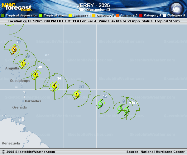 Copy of official data Tropical Storm Jerry Discussion Number 3 NWS National Hurricane Center Miami FL AL102025 1100 PM AST Tue Oct 07 2025 Satellite imagery and scatterometer data indicate that Jerry is somewhat disorganized this evening. Satellite imagery has been showing an exposed swirl of low-level clouds to the northwest and west of the convective mass, with scatterometer data suggesting this was the western end of an elongated surface circulation. The maximum scatterometer winds were in the 40-45 kt range, so the initial intensity remains 45 kt. NOAA and Air Force Reserve Hurricane Hunter aircraft are scheduled to investigate Jerry tomorrow. The initial motion is now west-northwestward or 285/20 kt. Jerry is currently on the south side of a strong low-level ridge, and this features should steer the storm west-northwestward for the next couple of days with some decrease in forward speed. This motion should take the core of Jerry near or to the north of the northern Leeward Islands late Thursday and Friday. This part of the forecast track is close to the various consensus models. However, the global model forecasts lie to the right of the consensus models, while the HAFS/HWRF models and the Google DeepMind ensemble mean are to the left of them. After the cyclone passes the Leeward Islands, it is expected to turn northward and eventually northeastward due to the development of a deep-layer trough over the eastern United States and the western Atlantic. Overall, the new forecast track is nudged just a little to the left of the previous track through 96 h. The latest satellite imagery and model analyses suggest that the environment Jerry is in is not quite as conducive for strengthening as thought earlier, with the cyclone likely to remain in moderate westerly shear for the next two to three days. In addition, the current structure favors a slower development rate. The latest intensity guidance has responded to these developments by being less bullish on developing the storm. While the new intensity forecast calls for the same 85 kt peak intensity as the previous forecast, it shows a slower rate of development, and the new forecast lies above the intensity consensus models. Based on the forecast and the uncertainties, Tropical Storm Watches have been issued for portions of the northern Leeward Islands. Interests elsewhere in the Leeward Islands, the Virgin Islands, and Puerto Rico should monitor the progress of Jerry. Key Messages: 1. Jerry is forecast to strengthen and could bring tropical storm conditions to portions of the northern Leeward Islands, where Tropical Storm Watches have been issued. 2. Heavy rainfall will impact portions of the Leeward Islands on Thursday, which could result in flash flooding, particularly in areas of higher terrain. FORECAST POSITIONS AND MAX WINDS INIT 08/0300Z 12.8N 48.7W 45 KT 50 MPH 12H 08/1200Z 13.6N 51.5W 50 KT 60 MPH 24H 09/0000Z 14.9N 55.1W 60 KT 70 MPH 36H 09/1200Z 16.5N 58.3W 65 KT 75 MPH 48H 10/0000Z 18.1N 60.7W 70 KT 80 MPH 60H 10/1200Z 19.8N 62.4W 75 KT 85 MPH 72H 11/0000Z 22.1N 63.3W 80 KT 90 MPH 96H 12/0000Z 26.7N 63.6W 85 KT 100 MPH 120H 13/0000Z 31.7N 60.1W 80 KT 90 MPH $$ Forecaster Beven |