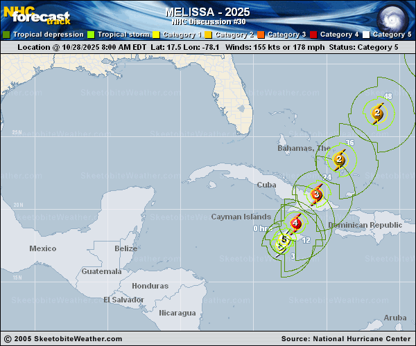 Copy of official data Hurricane Melissa Discussion Number 30 NWS National Hurricane Center Miami FL AL132025 500 PM EDT Tue Oct 28 2025 The eye of Melissa made landfall in western Jamaica near 17Z with maximum sustained winds estimated at 160 kt and a central pressure near 892 mb. Since that time, the hurricane has been weakening over the mountains of western Jamaica with the eye disappearing and some warming of the convective cloud tops. Based on these changes, the initial intensity has been reduced to a highly uncertain 125 kt. NOAA and Air Force Reserve Hurricane Hunter aircraft are scheduled to investigate Melissa this evening to provide better information on how much it has weakened. It should be noted that while Melissa's landfall intensity is among the strongest ever recorded in the Atlantic basin, it will take extensive post-analysis to determine exactly where it ranks among landfalling Atlantic hurricanes. The initial motion is now 025/7. A turn toward the northeast with an increase in forward speed is expected this evening, and this should bring the center near or over southeastern Cuba late tonight or early Wednesday. After that, an even faster motion toward the northeast should bring the center through the southeastern and central Bahamas on Wednesday and near Bermuda Thursday or Thursday night. After passing Bermuda, the cyclone should continue quickly northeastward into the north Atlantic. The track guidance envelope has shifted a little to the left (north and west) through 72 h since the last advisory, and the new forecast track during this time is also shifted a little to the north and west. While the center of Melissa is now emerging over water, it will probably not re-intensify significantly before landfall in Cuba due to the limited amount of time before landfall and an upper-level wind environment that is becoming less favorable. Based on this, the intensity forecast calls for little change in strength before Melissa reaches Cuba. After leaving Cuba, Melissa should encounter increasing southwesterly vertical shear that should cause gradual weakening, although the cyclone should still be at hurricane strength when it passes near Bermuda. Based on global model guidance, Melissa is forecast to become a strong extratropical cyclone over the North Atlantic by 96 h. Key Messages: 1. Jamaica: Remain in a safe shelter tonight. Damaging winds will continue over portions of Jamaica this evening. Catastrophic flash flooding, and landslides, are expected across the island tonight with widespread infrastructure damage, power and communication outages, and isolated communities. 2. Haiti and the Dominican Republic: Catastrophic flash flooding and landslides are expected across southwestern Haiti and southern portions of the Dominican Republic during the next day or so. In Haiti, extensive damage and isolation of communities is likely. Tropical storm conditions are expected later today and Wednesday. 3. Eastern Cuba: Heavy rainfall, flash flooding and landslides are expected soon. Life-threatening storm surge and damaging winds are likely to begin later today. Seek safe shelter. 4. Southeastern and Central Bahamas and the Turks and Caicos: Hurricane conditions, life-threatening storm surge, and heavy rainfall are expected across portions of the southeastern and central Bahamas on Wednesday. Complete preparations by tonight and follow local official guidance. Tropical storm conditions, heavy rains, and significant storm surge are expected in the Turks and Caicos Islands on Wednesday. 5. Bermuda: Hurricane conditions and heavy rainfall are possible in Bermuda beginning Thursday or Thursday night where a Hurricane Watch is now in effect. FORECAST POSITIONS AND MAX WINDS INIT 28/2100Z 18.5N 77.7W 125 KT 145 MPH 12H 29/0600Z 19.9N 76.7W 120 KT 140 MPH 24H 29/1800Z 22.2N 75.3W 100 KT 115 MPH 36H 30/0600Z 25.0N 73.2W 95 KT 110 MPH 48H 30/1800Z 28.9N 70.0W 90 KT 105 MPH 60H 31/0600Z 33.8N 64.8W 85 KT 100 MPH 72H 31/1800Z 39.0N 58.3W 70 KT 80 MPH 96H 01/1800Z 48.4N 42.2W 50 KT 60 MPH...POST-TROP/EXTRATROP 120H 02/1800Z 54.8N 25.1W 40 KT 45 MPH...POST-TROP/EXTRATROP $$ Forecaster Beven |