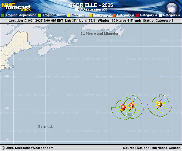 Copy of official data Hurricane Gabrielle Discussion Number 31 NWS National Hurricane Center Miami FL AL072025 1100 AM AST Wed Sep 24 2025 Gabrielle continues to show signs of gradual weakening. The convective pattern of the hurricane has become less symmetric, with restricted outflow on the western side of the system. Cold convective cloud tops obscure the center of the hurricane, and no eye feature is apparent in conventional satellite imagery. The latest subjective Dvorak and objective satellite intensity estimates range from 85-97 kt, and the initial intensity is lowered to 95 kt. Gabrielle is moving east-northeastward (075/22 kt) while embedded within westerly mid-latitude flow. The hurricane is expected to accelerate eastward to east-northeastward during the next couple of days, passing near or over the Azores Thursday night into Friday. By the weekend, Gabrielle is forecast to slow down and turn eastward and then southeastward over the eastern Atlantic. There are some forward speed differences in the track guidance, with the GFS notably faster than the rest of the models through much of the forecast period. The updated NHC track forecast has been adjusted slightly faster in line with the latest multi-model consensus aids, but otherwise is similar to the previous forecast. The track uncertainty increases by day 5, with some models (GFS, Google DeepMind) showing the system inland over Portugal while others (ECMWF, UKMET) keep the low offshore. Gabrielle will encounter increasing westerly shear and cooler waters during the next couple of days, so some weakening is expected. However, as Gabrielle begins to interact with an upper trough over the northern Atlantic and starts extratropical transition, the GFS and ECMWF depict a warm seclusion low structure with a band of hurricane-force winds wrapping around the western side of the circulation. This could result in significant wind impacts to the Azores, and a Hurricane Warning is in effect for those islands. The NHC intensity and radii forecasts lean more heavily on the global model wind fields through the first 48 h, as these better capture the anticipated structural changes of the cyclone. Once Gabrielle becomes fully extratropical, the system should weaken more rapidly within a dry mid-level environment over cooler waters. KEY MESSAGES: 1. Gabrielle is forecast to approach the Azores late on Thursday as a hurricane. A Hurricane Warning is in effect for all of the islands of the Azores, and hurricane conditions are likely Thursday night and Friday. Significant hurricane-force wind gusts are likely across portions of the Azores even after the center passes. 2. A dangerous storm surge is expected to produce significant coastal flooding in areas of onshore winds in the Azores. The surge will be accompanied by large and destructive waves. 3. Swells generated by Gabrielle will continue to affect Bermuda during the next couple of days, and the east coast of the United States from North Carolina northward and Atlantic Canada for the next day or so. These swells are likely to cause life-threatening surf and rip current conditions. Please consult products from your local weather office. FORECAST POSITIONS AND MAX WINDS INIT 24/1500Z 36.0N 48.7W 95 KT 110 MPH 12H 25/0000Z 36.3N 44.0W 85 KT 100 MPH 24H 25/1200Z 36.9N 37.3W 80 KT 90 MPH 36H 26/0000Z 38.3N 30.9W 80 KT 90 MPH 48H 26/1200Z 40.0N 25.1W 70 KT 80 MPH...POST-TROP/EXTRATROP 60H 27/0000Z 40.9N 20.7W 60 KT 70 MPH...POST-TROP/EXTRATROP 72H 27/1200Z 40.9N 16.5W 50 KT 60 MPH...POST-TROP/EXTRATROP 96H 28/1200Z 39.0N 11.0W 35 KT 40 MPH...POST-TROP/EXTRATROP 120H 29/1200Z 37.5N 8.5W 25 KT 30 MPH...POST-TROP/EXTRATROP $$ Forecaster Reinhart |