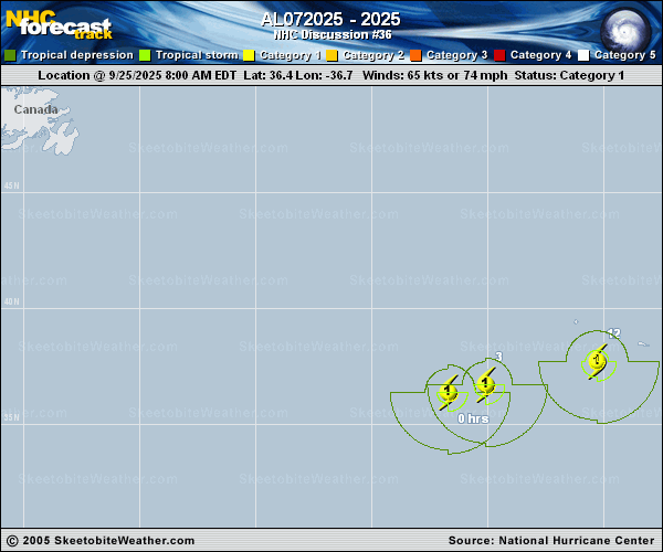 Copy of official data Post-Tropical Cyclone Gabrielle Discussion Number 36 NWS National Hurricane Center Miami FL AL072025 900 PM GMT Thu Sep 25 2025 Gabrielle has quickly lost tropical characteristics today in a highly sheared environment. Dry air infiltrating the circulation has left the low-level center partially exposed, and the overall cloud pattern has become more linear ahead of an approaching baroclinic system. Since Gabrielle no longer has organized deep convection and is beginning to interact with fronts, it is best designated as a post-tropical cyclone. The initial intensity is set at 60 kt based on earlier ASCAT data and the latest GFS and ECMWF wind fields. Weather radar data from Flores Island in the Azores indicate showers are spreading across the northwestern islands as conditions begin to deteriorate. The cyclone continues moving quickly eastward (080/26 kt) within strong westerly mid-latitude flow. The center of Gabrielle will pass quickly near or over the Azores later tonight and early Friday. Gabrielle is forecast to gradually decelerate over the next few days while eventually turning southeastward as a ridge builds to the west over the eastern Atlantic. As a result, the post-tropical cyclone should pass near or over the coast of Portugal later this weekend. No significant changes were made to the NHC track forecast with this update. The global models continue to show some increase in Gabrielle's peak winds tonight as the cyclone interacts with an approaching baroclinic system and completes extratropical transition. The NHC intensity forecast favors this solution and shows Gabrielle as a 65-kt post-tropical cyclone moving through the Azores early Friday. Thereafter, steady weakening is forecast as the low becomes vertically stacked and fills over the far eastern Atlantic. The global models are in good agreement on this solution. A Hurricane Warning remains in effect for the islands of the Azores. The NHC will continue to issue forecasts on Gabrielle as a post-tropical cyclone until the threat to the Azores has ended. KEY MESSAGES: 1. Gabrielle is expected to bring hurricane conditions to the islands of the Azores later tonight and early Friday. Significant hurricane-force wind gusts are likely across portions of the Azores even after the center passes. 2. A dangerous storm surge is expected to produce significant coastal flooding in areas of onshore winds in the Azores. The surge will be accompanied by large and destructive waves. 3. Heavy rainfall from Gabrielle could produce flash flooding across the terrain of the central Azores tonight through Friday morning. FORECAST POSITIONS AND MAX WINDS INIT 25/2100Z 37.1N 31.7W 60 KT 70 MPH...POST-TROPICAL 12H 26/0600Z 38.3N 27.4W 65 KT 75 MPH...POST-TROP/EXTRATROP 24H 26/1800Z 39.7N 21.9W 60 KT 70 MPH...POST-TROP/EXTRATROP 36H 27/0600Z 40.3N 16.7W 50 KT 60 MPH...POST-TROP/EXTRATROP 48H 27/1800Z 40.0N 12.7W 45 KT 50 MPH...POST-TROP/EXTRATROP 60H 28/0600Z 38.7N 10.1W 35 KT 40 MPH...POST-TROP/EXTRATROP 72H 28/1800Z 36.9N 8.2W 30 KT 35 MPH...POST-TROP/EXTRATROP 96H 29/1800Z 35.5N 7.5W 25 KT 30 MPH...POST-TROP/EXTRATROP 120H 30/1800Z...DISSIPATED $$ Forecaster Reinhart |