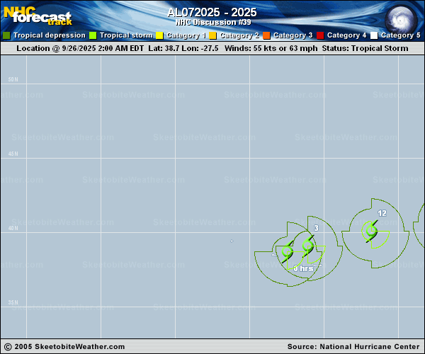 Copy of official data Post-Tropical Cyclone Gabrielle Discussion Number 39 NWS National Hurricane Center Miami FL AL072025 300 PM GMT Fri Sep 26 2025 Gabrielle is a storm-force extratropical cyclone with frontal boundaries that extend east-northeastward and southwestward from the cyclone. The center continues moving away from the Azores, and winds have dropped below gale-force across the islands. Recent ASCAT passes missed the center, but winds up to 43 kt were measured by the instrument well away from the center in the southeast quadrant. Global models show 10-meter winds up to 55 kt in their fields at the current time, so the initial intensity will be held at 55 kt. Some intensification is possible this evening, and the 06Z GFS model indicates a sting jet could briefly cause winds up to 70-75 kt in the western semicircle in about 6 h from now. The NHC forecast brings Gabrielle to 60 kt in 12 h, but doesn't necessarily account for brief stronger winds that could occur between the current time and the 12 h point. Global models are in good agreement on steady weakening after hour 12, and the NHC intensity forecast is based on a blend of the GFS and ECMWF. It's possible that gale force winds near 35 kt, with higher gusts, could affect portions of the west coast of Portugal around early Sunday. The current motion is quickly east-northeastward, or 065/27 kt. A turn toward the east along with a decrease in forward speed is expected in 12-24 h. After that, the cyclone is expected to turn southeastward as it approaches the coast of Portugal. This should be followed by an even slower southeastward to southward motion while Gabrielle decays and eventually dissipates near southern Portugal and northern Morocco. The forecast track has been shifted slightly to the northeast, or left, of the previous NHC track, closer to the latest simple and corrected consensus models. This is the final advisory issued by the National Hurricane Center on Gabrielle. Future information on marine impacts can be found in High Seas Forecasts issued by Meteo France under WMO header FQNT50 LFPW and available on the web at https://tgftp.nws.noaa.gov/data/raw/fq/fqnt50.lfpw..txt. Future information on potential land-based impacts in Portugal can be found in products issued by the Portugal Meteorological Institute at https://www.ipma.pt/en/index.html KEY MESSAGES: 1. Winds across the Azores will continue to subside this afternoon. 2. Any flooding caused by Gabrielle across the high terrain of the central Azores should subside this afternoon. FORECAST POSITIONS AND MAX WINDS INIT 26/1500Z 40.0N 22.8W 55 KT 65 MPH...POST-TROPICAL 12H 27/0000Z 40.8N 18.6W 60 KT 70 MPH...POST-TROP/EXTRATROP 24H 27/1200Z 41.0N 13.8W 50 KT 60 MPH...POST-TROP/EXTRATROP 36H 28/0000Z 40.1N 10.4W 45 KT 50 MPH...POST-TROP/EXTRATROP 48H 28/1200Z 38.5N 8.3W 35 KT 40 MPH...POST-TROP/EXTRATROP 60H 29/0000Z 36.9N 7.2W 30 KT 35 MPH...POST-TROP/EXTRATROP 72H 29/1200Z 35.6N 7.1W 25 KT 30 MPH...POST-TROP/EXTRATROP 96H 30/1200Z...DISSIPATED $$ Forecaster Hagen |