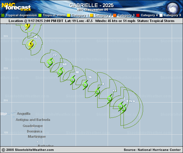 Copy of official data Tropical Storm Gabrielle Discussion Number 4 NWS National Hurricane Center Miami FL AL072025 1100 PM AST Wed Sep 17 2025 The overall structure of Gabrielle hasn't changed too much. The cloud pattern of the cyclone consists of a large comma shape. GOES-19 CIRA proxy-vis imagery and a recent 17/2342 UTC ASCAT-B overpass clearly indicate that the surface wind center is at the bottom of the upper portion of the comma head. The strongest ASCAT wind vectors are the same magnitudes as the pass from 12 hours prior, so the intensity is held at 45 kt for this advisory. Gabrielle still has a very large and broad envelope of convection and winds. It is quite atypical to see a structure like this for a tropical cyclone in this part of the world. Strong westerly shear should continue on Thursday, then gradually abate at some point on Friday. The other factor that is detrimentally impacting Gabrielle is the very dry air seen on water vapor imagery in the open area of the comma, to the south and west of the center. Even after the shear abates, Gabrielle will continue moving through an environment of dry air through Friday, with moistening along its path over the weekend. The official intensity forecast has been decreased during the 24-48 h period, in agreement with most of the reliable intensity guidance. The new NHC intensity forecast is near the middle of the guidance envelope through 48 hours, then near the high end of the guidance thereafter, and still calls for Gabrielle to be a hurricane at days 4-5. The center has jogged westward since the previous advisory, but the longer term motion is estimated to be west-northwestward, or 300/14 kt. A similar motion is expected for the next couple of days, followed by a gradual turn toward the west-northwest as Gabrielle moves on the south side of a subtropical ridge. Over the weekend, the cyclone should round the southwestern periphery of the ridge and turn northwestward as it catches up to a slow-moving upper-level low that should be located just west of Gabrielle. A northward motion is expected in 4-5 days as Gabrielle gets closer to the mid-latitude westerlies, which should induce a northeastward turn in about 5 days. The new NHC track forecast is shifted significantly to the left (southwest) of the previous forecast through 72 h but near the previous track again at days 4-5. The forecast is in fairly good agreement with the Google Deep Mind ensemble mean through 72 h, then leans toward the HCCA Corrected Consensus at days 4-5. Track forecast confidence remains relatively low. This system should pass well east and north of the Leeward Islands, but interests in Bermuda should monitor forecasts during the next several days. FORECAST POSITIONS AND MAX WINDS INIT 18/0300Z 19.5N 49.5W 45 KT 50 MPH 12H 18/1200Z 20.3N 51.0W 45 KT 50 MPH 24H 19/0000Z 21.3N 52.9W 40 KT 45 MPH 36H 19/1200Z 22.2N 54.9W 40 KT 45 MPH 48H 20/0000Z 23.3N 56.9W 40 KT 45 MPH 60H 20/1200Z 24.5N 58.8W 45 KT 50 MPH 72H 21/0000Z 25.8N 60.3W 50 KT 60 MPH 96H 22/0000Z 28.9N 62.7W 65 KT 75 MPH 120H 23/0000Z 32.5N 62.0W 75 KT 85 MPH $$ Forecaster Hagen |