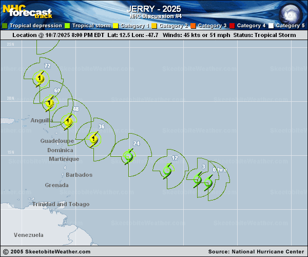 Copy of official data Tropical Storm Jerry Discussion Number 4 NWS National Hurricane Center Miami FL AL102025 500 AM AST Wed Oct 08 2025 Jerry remains poorly organized this morning. Proxy-visible satellite images indicate the low-level center of the storm is still partially exposed and elongated, with deep convection displaced well to the south and east of the center. With no signs of improved convective organization, the initial intensity of Jerry is held at 45 kt, which is supported by a 3.0/45 kt Dvorak classification from TAFB and earlier scatterometer data. NOAA and Air Force Reserve Hurricane Hunter aircraft are scheduled to investigate Jerry today. The storm is racing west-northwestward (285/20 kt) to the south of a strong low-level ridge extending across the central Atlantic. A continued west-northwestward motion with some decrease in forward speed is expected over the next couple of days. This should bring the center of the system near or to the north of the northern Leeward Islands late Thursday into Friday. This part of the NHC track forecast remains near the center of the guidance envelope, between the simple and corrected consensus aids. Jerry is forecast to turn northward by Friday as a deep-layer trough over the western Atlantic weakens the ridge to the north of the system. Then, Jerry should accelerate northeastward within the flow ahead of this trough through early next week. Overall, no noteworthy track changes were made with this update. Only modest near-term strengthening is expected due to the sheared structure of Jerry and its fast forward motion. As the storm begins to slow down, Jerry should be able to become more vertically aligned and establish an inner core over very warm waters within generally favorable environmental conditions. The NHC intensity forecast shows a slower rate of strengthening through 24 h, but Jerry is still forecast to become a hurricane on Thursday. Additional strengthening is anticipated thereafter, and the NHC prediction trends on the higher side of the intensity guidance later in the forecast period, closer to HCCA and some of the regional hurricane models. A Tropical Storm Watch remains in effect for many of the northern Leeward Islands. Interests elsewhere in the Leeward Islands, the Virgin Islands, and Puerto Rico should monitor the latest updates. KEY MESSAGES: 1. Jerry is forecast to strengthen and could bring tropical storm conditions to portions of the northern Leeward Islands, where Tropical Storm Watches have been issued. 2. Heavy rainfall will impact portions of the Leeward Islands on Thursday into early Friday, which could result in flash flooding, particularly in areas of higher terrain. FORECAST POSITIONS AND MAX WINDS INIT 08/0900Z 13.3N 50.7W 45 KT 50 MPH 12H 08/1800Z 14.2N 53.4W 50 KT 60 MPH 24H 09/0600Z 15.7N 56.7W 55 KT 65 MPH 36H 09/1800Z 17.3N 59.5W 65 KT 75 MPH 48H 10/0600Z 18.9N 61.5W 70 KT 80 MPH 60H 10/1800Z 21.1N 62.9W 75 KT 85 MPH 72H 11/0600Z 23.6N 63.2W 80 KT 90 MPH 96H 12/0600Z 28.3N 63.0W 80 KT 90 MPH 120H 13/0600Z 32.5N 58.0W 70 KT 80 MPH $$ Forecaster Reinhart |