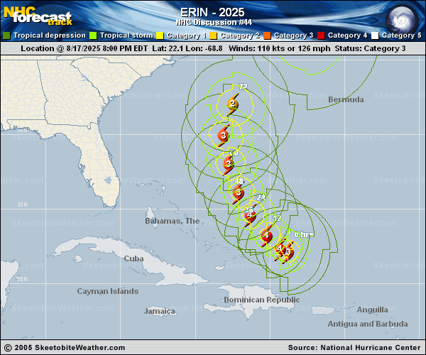 Copy of official data Hurricane Erin Discussion Number 44 NWS National Hurricane Center Miami FL AL052025 500 AM AST Fri Aug 22 2025 Erin has begun extratropical transition. The center is now exposed to the southwest of the remaining central deep convection due to 30-35 kt of southwesterly shear. In addition, the hurricane has developed an expansive cirrus shield to the north, and stratus and stratocumulus clouds off the Mid-Atlantic U.S. coast suggest that cold air advection is occuring in the hurricane's wake. Based on the degradation of the satellite presentation since the previous full advisory, the initial intensity is lowered to 80 kt. The wind field continues to grow, and tropical-storm-force winds now extend as far as 320 n mi from the center. The hurricane has been moving northeastward, or 055/19 kt. Erin will accelerate toward the east-northeast, embedded within the mid-latitude westerlies, reaching a peak speed of about 35 kt in 48 hours. A significant reduction in forward speed is then expected on days 3 through 5 as the cyclone becomes cut off from the westerlies, stalling or meandering just south of Iceland by the middle of next week. The NHC track forecast is close to a blend of the GFS, ECMWF, and HCCA models, and no significant changes were made from the previous forecast. Global model thermal fields, model-simulated satellite imagery, and phase-space diagrams indicate that Erin should become post-tropical by 24 hours. The NHC intensity forecast generally follows a blend of the GFS and ECMWF surface wind fields, showing only some weakening during the next 36-48 hours. Global models are in good agreement that the post-tropical cyclone will phase with an upper-level trough in 48-60 hours, inducing baroclinic reintensification and possibly the development of a sting jet on the back side of the low. The NHC official forecast shows that strengthening at 60 hours. Steady weakening, and even more broadening of the wind field, should occur on days 3 through 5 as the low becomes vertically stacked south of Iceland. KEY MESSAGES: 1. Erin will continue to produce life-threatening surf and rip currents along the beaches of the Bahamas, much of the east coast of the U.S., Bermuda, and Atlantic Canada during the next several days. Beachgoers in those areas should follow advice from lifeguards, local authorities, and beach warning flags. 2. Coastal flooding is expected at times of high tide along portions of the U.S. Mid-Atlantic and New England coasts through tonight, making some roads impassable. Large waves along the coast could also cause significant beach erosion and overwash. 3. Gusts to gale force are possible along the coast of Nova Scotia today and the Avalon Peninsula of Newfoundland on Saturday. FORECAST POSITIONS AND MAX WINDS INIT 22/0900Z 38.6N 65.3W 80 KT 90 MPH 12H 22/1800Z 39.9N 61.6W 80 KT 90 MPH 24H 23/0600Z 41.8N 55.2W 75 KT 85 MPH...POST-TROP/EXTRATROP 36H 23/1800Z 44.1N 47.3W 70 KT 80 MPH...POST-TROP/EXTRATROP 48H 24/0600Z 47.4N 38.4W 70 KT 80 MPH...POST-TROP/EXTRATROP 60H 24/1800Z 50.8N 30.6W 75 KT 85 MPH...POST-TROP/EXTRATROP 72H 25/0600Z 53.9N 24.8W 65 KT 75 MPH...POST-TROP/EXTRATROP 96H 26/0600Z 58.0N 20.9W 45 KT 50 MPH...POST-TROP/EXTRATROP 120H 27/0600Z 58.2N 20.1W 40 KT 45 MPH...POST-TROP/EXTRATROP $$ Forecaster Berg |