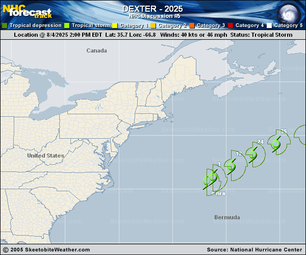 Copy of official data Tropical Storm Dexter Discussion Number 5 NWS National Hurricane Center Miami FL AL042025 1100 PM AST Mon Aug 04 2025 Dexter continues to be disrupted by strong westerly vertical wind shear, with its associated deep convection being displaced to the east of the low-level center. The storm's cloud pattern is very ragged-looking at this time and lacks convective banding features. Satellite-based intensity estimates using subjective and objective methods range from 30 kt to 47 kt. Blending these values, the advisory intensity estimate remains 40 kt, though a recent scatterometer pass suggests this might be generous. Although there is some uncertainty in the center location using infrared imagery, it appears that the forward speed has slowed somewhat and the current motion estimate is around 050/11 kt. Dexter is near the southern edge of a belt of mid-level westerlies. The track guidance is in general agreement on a northeastward to east-northeastward motion for the next several days. However, it is possible that the system could become completely decoupled and move more slowly in the low-level flow. The official forecast assumes that the cyclone will retain enough vertical coherency to be steered at least partially by the mid-level flow. The NHC track forecast is fairly close to the latest corrected consensus, HCCA, guidance. There is no sign that the strong shear in Dexter's environment will abate. In fact, the SHIPS model indicates that the vertical wind shear will increase even more over the next few days. Therefore, it is not likely that the system will be able to strengthen as a true tropical cyclone. The official forecast allows for slight intensification due to baroclinic processes. Simulated infrared imagery and the FSU phase space predictions from the global models suggest that Dexter will likely make the transition into an extratropical cyclone in 2-3 days. FORECAST POSITIONS AND MAX WINDS INIT 05/0300Z 36.8N 65.6W 40 KT 45 MPH 12H 05/1200Z 37.8N 64.1W 40 KT 45 MPH 24H 06/0000Z 38.9N 62.1W 40 KT 45 MPH 36H 06/1200Z 39.6N 59.7W 40 KT 45 MPH 48H 07/0000Z 40.2N 56.7W 40 KT 45 MPH 60H 07/1200Z 41.2N 52.9W 45 KT 50 MPH...POST-TROP/EXTRATROP 72H 08/0000Z 42.8N 48.0W 45 KT 50 MPH...POST-TROP/EXTRATROP 96H 09/0000Z 46.0N 39.0W 45 KT 50 MPH...POST-TROP/EXTRATROP 120H 10/0000Z 49.0N 29.0W 40 KT 45 MPH...POST-TROP/EXTRATROP $$ Forecaster Pasch |