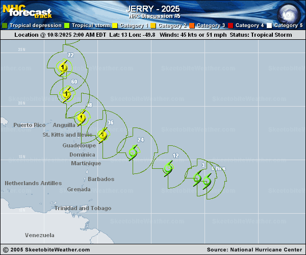 Copy of official data Tropical Storm Jerry Discussion Number 5 NWS National Hurricane Center Miami FL AL102025 1100 AM AST Wed Oct 08 2025 Jerry is a sheared tropical cyclone this morning, with the low-level center racing out ahead of the associated deep convection. Despite this structure, a NOAA Hurricane Hunter aircraft measured a peak 700-mb wind of 56 kt, and Tail-Doppler radar data showed winds of around 75 kt at 500 meters above the surface. Even using a conservative reduction factor for this data of 70 percent yields surface winds of about 50 kt. Recent ASCAT data also confirm that the initial intensity is about 50 kt. Jerry remains on a quick west-northwestward trajectory (285/20 kt), steered by a low- to mid-level ridge to the north. The ridge only extends as far west as the longitude of the Lesser Antilles, and the weakness to the west is expected to cause Jerry to turn northwestward by 36 hours, with the center potentially passing only 60-70 n mi northeast of the northern Leeward Islands. The NHC track forecast is along the western side of the guidance envelope during the first 36 hours of the forecast. After 36 hours, the track guidance has trended a bit to the east, showing a sharper recurvature over the central Atlantic resulting from a large extratropical cyclone that is expected to develop near the U.S. east coast over the weekend. Jerry is moving directly against the analyzed shear vector, and vertical model soundings suggest this orientation may not change any time soon. It's becoming more likely that Jerry may remain a sheared tropical storm for the next few days, and the intensity guidance has responded accordingly. The updated NHC forecast still shows the possibility of gradual strengthening through 60-72 hours, however the peak has been lowered by about 10 kt. It's worth noting that only two of the reliable models, the HWRF and COAMPS-TC, are still higher than the official forecast, and the IVCN and HCCA consensus aids suggest additional decreases in the forecast intensity could be possible in future advisories. KEY MESSAGES: 1. Jerry could bring tropical storm conditions to portions of the northern Leeward Islands late Thursday and Thursday night. 2. Heavy rainfall will impact portions of the Leeward Islands, British Virgin Islands, and U.S. Virgin Islands from Thursday into Saturday morning, which could result in flash flooding, particularly in areas of steep terrain. FORECAST POSITIONS AND MAX WINDS INIT 08/1500Z 13.9N 52.7W 50 KT 60 MPH 12H 09/0000Z 14.7N 55.1W 55 KT 65 MPH 24H 09/1200Z 16.1N 58.2W 60 KT 70 MPH 36H 10/0000Z 17.9N 60.5W 60 KT 70 MPH 48H 10/1200Z 20.0N 61.9W 65 KT 75 MPH 60H 11/0000Z 22.5N 62.4W 70 KT 80 MPH 72H 11/1200Z 25.1N 62.2W 70 KT 80 MPH 96H 12/1200Z 29.6N 61.0W 70 KT 80 MPH 120H 13/1200Z 32.7N 56.9W 65 KT 75 MPH $$ Forecaster Berg |