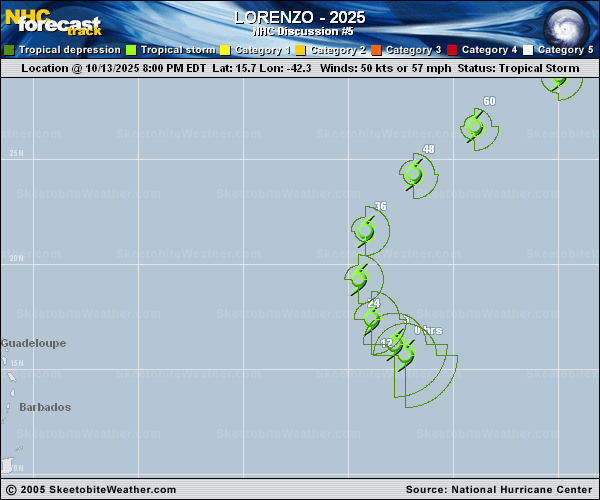 Copy of official data Tropical Storm Lorenzo Discussion Number 5 NWS National Hurricane Center Miami FL AL122025 500 AM AST Tue Oct 14 2025 Lorenzo has the appearance of a sheared tropical cyclone, with the estimated center exposed about 30 to 45 n mi outside the northwestern edge of the cyclone's main convective mass. GOES-19 proxy vis imagery suggests that Lorenzo's exposed low-level center has been moving farther away from the convection to the northwest over the past several hours. Lorenzo is struggling, even though SHIPS guidance and UW-CIMSS analyses indicate that the cyclone has reached a lower wind shear environment compared to the stronger shear it was experiencing yesterday, since the upper low to the west of Lorenzo has moved farther away. The latest subjective and objective intensity estimates range from 31-45 kt. The initial intensity will be maintained at 50 kt for this advisory based on the earlier evening ASCAT data, but if convection doesn't develop closer to the low-level center soon, then the winds could start to decrease. The initial motion estimate is northwestward, or 310 degrees at 13 kt. The northwest motion should continue today as Lorenzo approaches a weakness in the subtropical ridge. A turn to the north is expected tonight, with a northeastward motion expected Wednesday and Thursday as the storm moves around the northwestern periphery of the subtropical ridge into the faster flow regime of the mid-latitude westerlies. The NHC forecast was nudged slightly westward through the first 60 hours, and is very near the HFIP Corrected Consensus (HCCA) model during that time period. Thereafter, the forecast is more or less similar to the previous NHC prediction, showing a partial clockwise loop from days 3-5, as Lorenzo (or its remnants) rotate southeastward and then southwestward around the aforementioned subtropical high. Yesterday, some of the global and regional models like the GFS, HWRF and HMON, as well as some of the ECMWF and Google DeepMind ensemble members were holding onto Lorenzo through the 5-day period, even indicating some strengthening over the next few days. However, the latest cycle of global and regional models all show Lorenzo either dissipating completely or becoming a remnant low by hour 72, with fewer ECMWF and Google Deep Mind ensemble members holding onto the system compared to the previous few cycles. In fact, most of the reliable model guidance shows a steady intensity for a day or so, followed by weakening, and then dissipation in about 3 days. The new NHC intensity forecast is slightly lower than the previous prediction, but will not bite off yet on the aforementioned model solutions since Lorenzo is forecast to remain in relatively low shear and warm ocean temperatures for the next few days. The NHC intensity forecast is at the high end of the intensity guidance suite through hour 12, and then is above all of the intensity models from hour 24 onward. The intensity forecast is low confidence, and it's possible that Lorenzo could dissipate sooner than forecast. FORECAST POSITIONS AND MAX WINDS INIT 14/0900Z 17.3N 44.1W 50 KT 60 MPH 12H 14/1800Z 18.4N 44.8W 50 KT 60 MPH 24H 15/0600Z 20.5N 44.8W 50 KT 60 MPH 36H 15/1800Z 23.0N 43.5W 55 KT 65 MPH 48H 16/0600Z 25.5N 41.0W 55 KT 65 MPH 60H 16/1800Z 27.9N 37.4W 50 KT 60 MPH 72H 17/0600Z 29.4N 34.0W 50 KT 60 MPH 96H 18/0600Z 28.5N 30.0W 45 KT 50 MPH 120H 19/0600Z 25.9N 32.5W 40 KT 45 MPH...POST-TROPICAL $$ Forecaster Hagen |