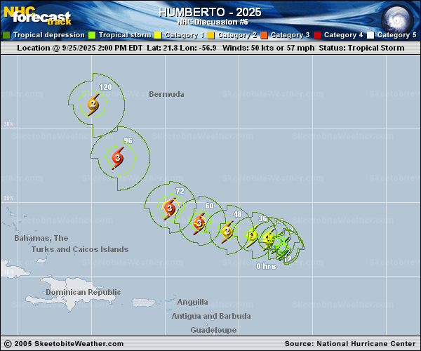 Copy of official data Tropical Storm Humberto Discussion Number 6 NWS National Hurricane Center Miami FL AL082025 1100 PM AST Thu Sep 25 2025 Humberto continues to gain strength while moving slowly over the central Atlantic. The system is exhibiting a growing CDO feature with cloud tops to near -70 deg C, along with some convective bands over the eastern portion of the circulation, where most of the lightning flashes are currently occurring. The advisory intensity is increased to 55 kt, in agreement with subjective Dvorak classifications from both TAFB and SAB and a blend of objective satellite estimates from UW-CIMSS. The storm's forward speed is quite slow with a motion estimate of only 320/3 kt. Steering currents are not strong at this time since the subtropical ridge to the north of Humberto is quite weak. Global model forecasts show the ridge strengthening with time and in a few days the cyclone should move somewhat faster toward the northwest and turn northward in the vicinity of 70 W longitude. By the end of the forecast period, after Humberto passes north of the ridge, the system should begin accelerating northeastward. Cirrus motions indicate that the vertical wind shear over Humberto has lessened, and the SHIPS model output does not show the shear increasing much through 72 hours. Sea surface temperatures are expected to be very warm along the projected path of the cyclone, and the system should remain embedded in a moist air mass. The official forecast continues to call for significant strengthening during the next few days. This is consistent with the latest corrected consensus, HCCA, forecast which also shows Humberto intensifying into a major hurricane this weekend. FORECAST POSITIONS AND MAX WINDS INIT 26/0300Z 22.2N 57.1W 55 KT 65 MPH 12H 26/1200Z 22.4N 57.6W 65 KT 75 MPH 24H 27/0000Z 22.7N 58.5W 75 KT 85 MPH 36H 27/1200Z 22.9N 59.9W 90 KT 105 MPH 48H 28/0000Z 23.4N 61.8W 105 KT 120 MPH 60H 28/1200Z 24.3N 63.8W 110 KT 125 MPH 72H 29/0000Z 25.4N 65.7W 110 KT 125 MPH 96H 30/0000Z 29.0N 69.0W 100 KT 115 MPH 120H 01/0000Z 32.6N 69.7W 90 KT 105 MPH $$ Forecaster Pasch |