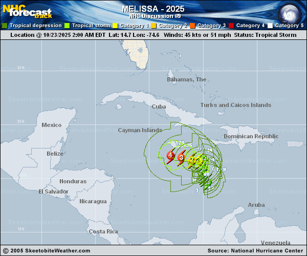 Copy of official data Tropical Storm Melissa Discussion Number 9 NWS National Hurricane Center Miami FL AL132025 1100 AM EDT Thu Oct 23 2025 Melissa's structure has undergone a metamorphosis this morning. Convection developed up-shear of the system for the first time after the prior advisory, with some evidence of loose banding beginning to take shape. This structure could indicate that the westerly vertical wind shear that has been affecting the system the last couple of days is beginning to subside, and could allow the low and mid-level centers to become better aligned. For now though, the surface circulation remains rather broad and still tilted to the northeast with height. The peak 850 mb flight level winds from the ongoing Air Force Reserve reconnaissance mission have only been 40 to 45 kt. A blend of the lower aircraft data and higher satellite estimates results in the initial intensity being adjusted to 40 kt for this advisory. The center of the tropical storm may have reformed northward from last night, as the last several aircraft fixes indicates a very slow north-northwestward drift, estimated at 345/2 kt. As has been emphasized over the last few discussions, Melissa is likely to continue moving very slowly as it drifts northward towards a weakness in the mid-level ridging produced by an upper-level trough over the Bahamas. This trough is expected to lift out over the next 24-48 hours, allowing a narrow mid-level ridge to build back in from the west. In response, the track guidance shows Melissa turning westward between 48 to 96 h, but the ridge remains centered to the northwest, likely explaining why the forward motion is expected to remain quite slow. Compared to 24 h ago, the guidance is in better agreement on this westward turn, but how sharp this turn is, and how far northward Melissa makes it in the meantime still remains uncertain. A variety of model solutions show Melissa south of Jamaica (ECMWF), over Jamaica (GDMI), or north of Jamaica (HMON). The track forecast this cycle continues to split the difference between the HFIP Corrected Consensus Approach (HCCA) and GDMI solutions, and is shifted a bit north compared to the previous track forecast. The shear over Melissa has been gradually decreasing, now under 20 kt in the latest ECMWF-SHIPS guidance. This shear is expected to decrease further, remaining between 10-15 kt over the remainder of the forecast period. Other environmental favors are also very favorable, with 30-31 C sea-surface temperatures, and sufficient mid-level moisture. The main intensity challenge is predicting when Melissa becomes a more symmetric and vertical aligned tropical cyclone. Given the improved structure seen on satellite, it seems the time-table for this process to occur has moved up in the forecast period. Assuming Melissa can then establish an inner core in the next 48 hours, a period of rapid intensification also appears increasingly likely, sometime in the 2 to 3 day period. The latest NHC intensity forecast now makes Melissa a hurricane in 48 hours, a major hurricane in 72 h, and a peak intensity of 115 kt in 96 hours. The end intensity could be conservative if Melissa ends up further south of Jamaica with less land interaction, as suggested by the 00z ECMWF and HAFS guidance. Over this period, the tropical cyclone is expected to grow in size, and likely be a large and dangerous hurricane towards the end of the forecast period. Key Messages: 1. Melissa is expected to meander over the central Caribbean Sea for several days and become a major hurricane by late this weekend or early next week. Due to MelissaG��s slow motion, the risk of a prolonged multi-day period of potentially damaging winds, heavy rainfall resulting in life-threatening flash flooding and numerous landslides, and coastal flooding continues to increase for Jamaica. Preparations to protect life and property should be rushed to completion, since strong winds and flooding rains could begin in Jamaica by Friday or Saturday. 2. Strong winds could also potentially last for a day or more over the Tiburon peninsula of Haiti. In addition, interests in Cuba and the rest of Haiti are urged to continue monitoring the latest forecasts for Melissa. 3. In addition to Jamaica, Melissa will produce heavy rainfall across portions of the southern Dominican Republic and southern Haiti through this weekend and continuing into next week. This rainfall will result in significant, life-threatening flash flooding and numerous landslides. FORECAST POSITIONS AND MAX WINDS INIT 23/1500Z 15.4N 74.9W 40 KT 45 MPH 12H 24/0000Z 15.9N 75.0W 45 KT 50 MPH 24H 24/1200Z 16.3N 74.9W 50 KT 60 MPH 36H 25/0000Z 16.7N 74.9W 60 KT 70 MPH 48H 25/1200Z 17.1N 75.2W 75 KT 85 MPH 60H 26/0000Z 17.3N 75.8W 90 KT 105 MPH 72H 26/1200Z 17.4N 76.4W 105 KT 120 MPH 96H 27/1200Z 17.4N 77.7W 115 KT 130 MPH 120H 28/1200Z 17.7N 78.4W 115 KT 130 MPH $$ Forecaster Papin |